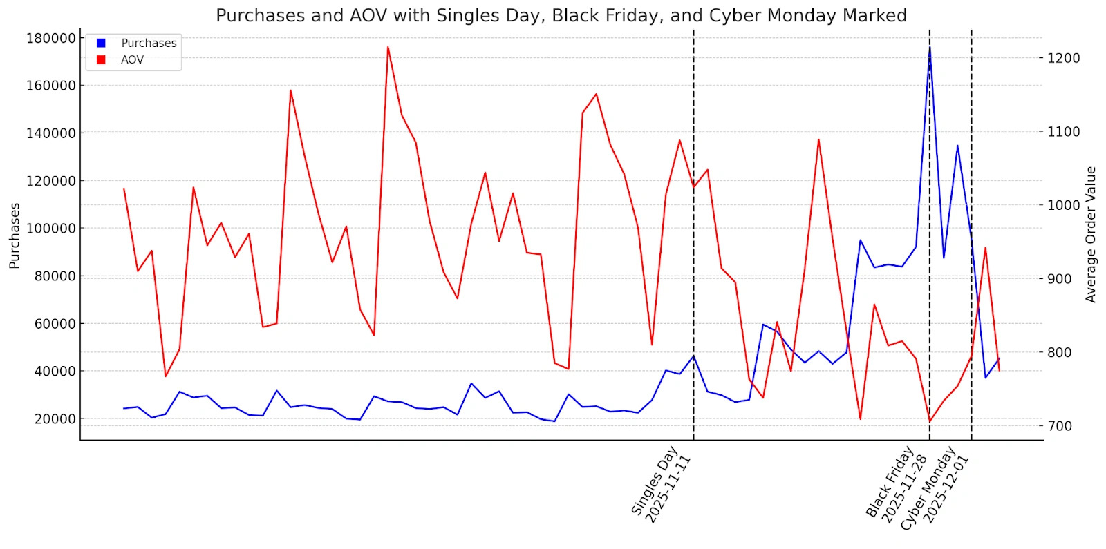 Singles Day såg första toppen med 84 % fler köp än normala nivåer, men Black Friday stod för den största ökningen med 600% fler köp och 250% högre omsättning. Däremot så sjönk snittordervärdet (AOV) till det lägsta värdet på Black Friday.